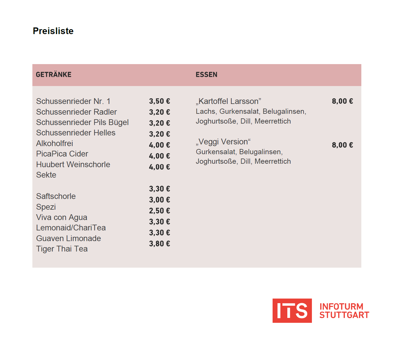 Eintrittspreis: 40 € – inklusive Begrüßungsdrink, zweistündiger Baustellenführung ins Herz der Neuen Bahnsteighalle, Ausklang auf der Dachterrasse des ITS mit einer Lachskartoffel und einem Glas Schnaps.